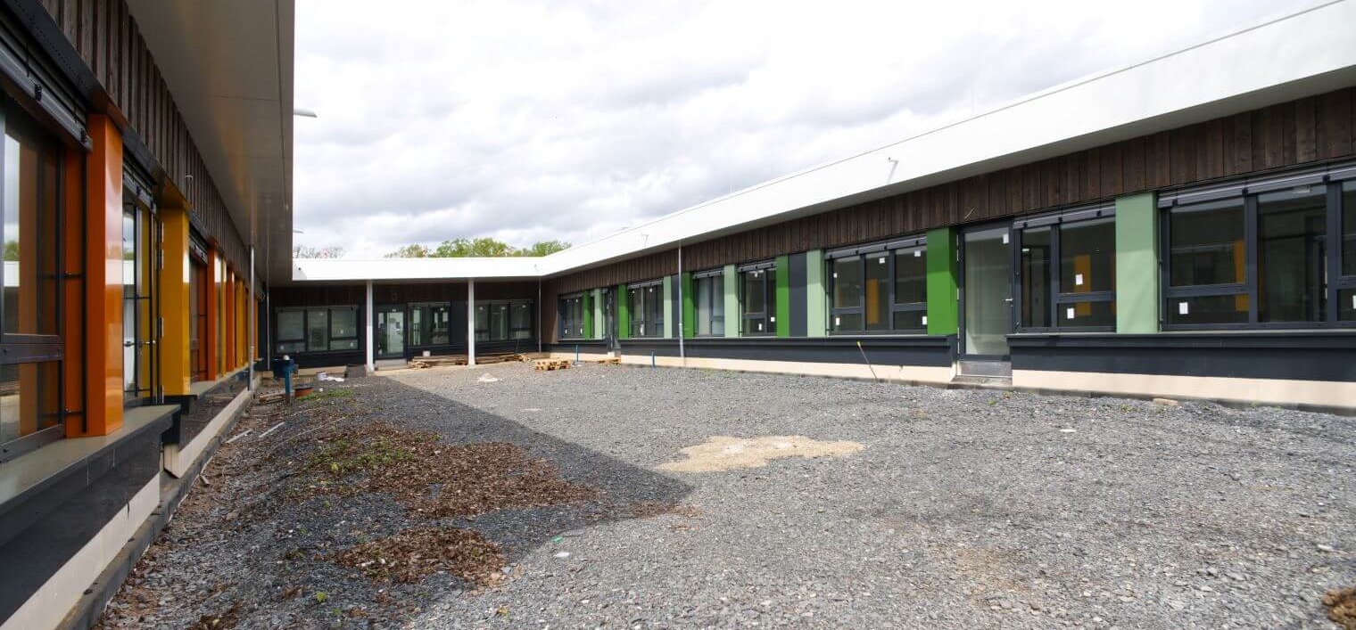 Besonderheiten bei diesem Schulgebäude sind die extensive Dachbegrünung, kombiniert mit Photovoltaikanlage und die mit Stauraum versehen Sitzbänke, die an den Fenstern angebracht werden und somit einen großartigen Blick in die jeweiligen Innenhöfe ermöglichen. Lange Blickachsen und viele Fensterfronten machen das Gebäude zu einer tollen Lernumgebung.