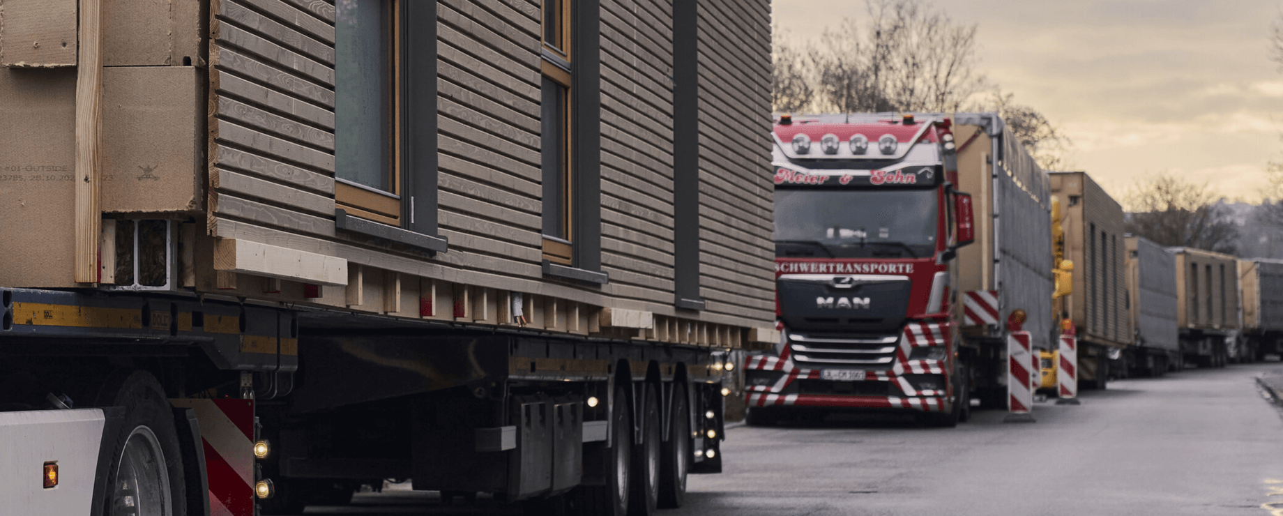 Die fertig produzierten Module werden termingenau vom Werk zur Baustelle transportiert. Eine präzise Logistik stellt sicher, dass Montageabläufe ohne Verzögerungen stattfinden können.