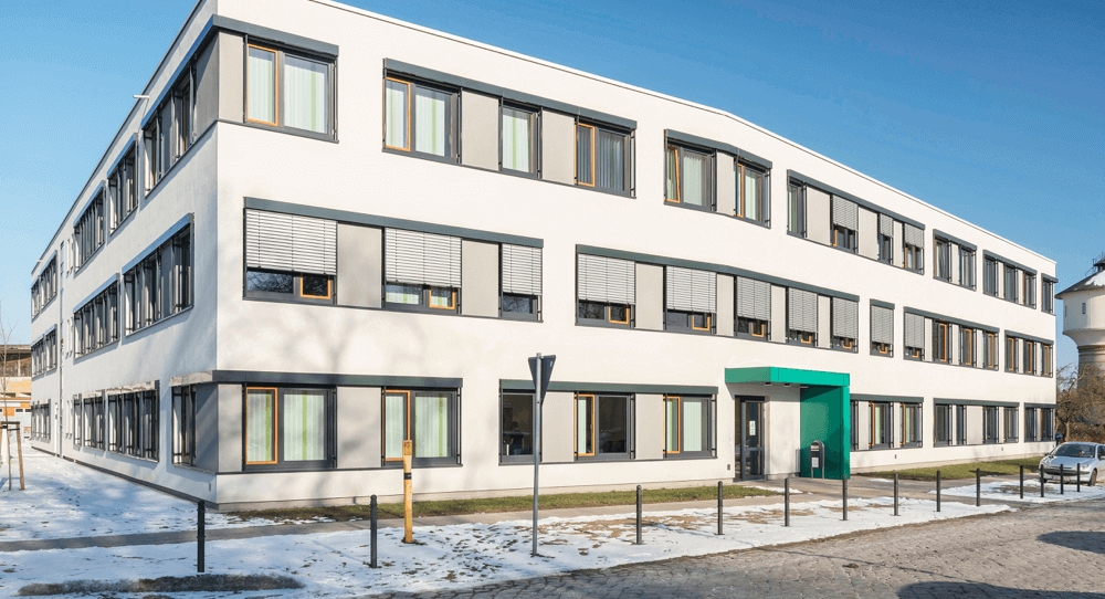 In dem L-förmigen Verwaltungsgebäude wurde Platz für 200 Mitarbeiter geschaffen. „Mit dem Neubau wird auch der Gesundheitswirtschaftsstandort Mecklenburg-Vorpommern gestärkt. Die Branche ist ein Wachstumsmotor und hat noch ordentliches Potential. Rund jeder fünfte Arbeitsplatz in Mecklenburg-Vorpommern besteht innerhalb der Gesundheitswirtschaft“, sagte Harry Glawe, Minister für Wirtschaft, Bau und Tourismus gegenüber dem Güstrower Anzeiger. KLEUSBERG hat den Neubau aus insgesamt 72 Modulen errichtet. Das nach den Entwürfen von RICHTER Architekten entstandene Gebäude sieht schon heute eine langfristige Nutzung durch Drittverwendung vor. Heute Büros, in Zukunft Wohnungen: Der generell barrierefreie Komplex erlaubt eine große Bandbreite an Nutzungsmöglichkeiten – ohne in die Gebäudestruktur eingreifende Umbauarbeiten. 2-teilige Fensterelemente samt Außenraffstore versprechen während der Arbeit angenehme Lichtverhältnisse und werten die Fassadengestaltung, zusammen mit dem umgesetzten Farbkonzept, zusätzlich auf. Neben Einzel- und Großraumbüros bietet der Gebäudekomplex unter anderem Besprechungs- und Multifunktionsräume mit moderner Medientechnik, Lerninseln für Kunden, ein Praxiscenter sowie Gruppenarbeitsräume. In der stilvoll eingerichteten Teeküche können die Mitarbeiterinnen und Mitarbeiter ihre Pausenzeiten ungestört genießen.