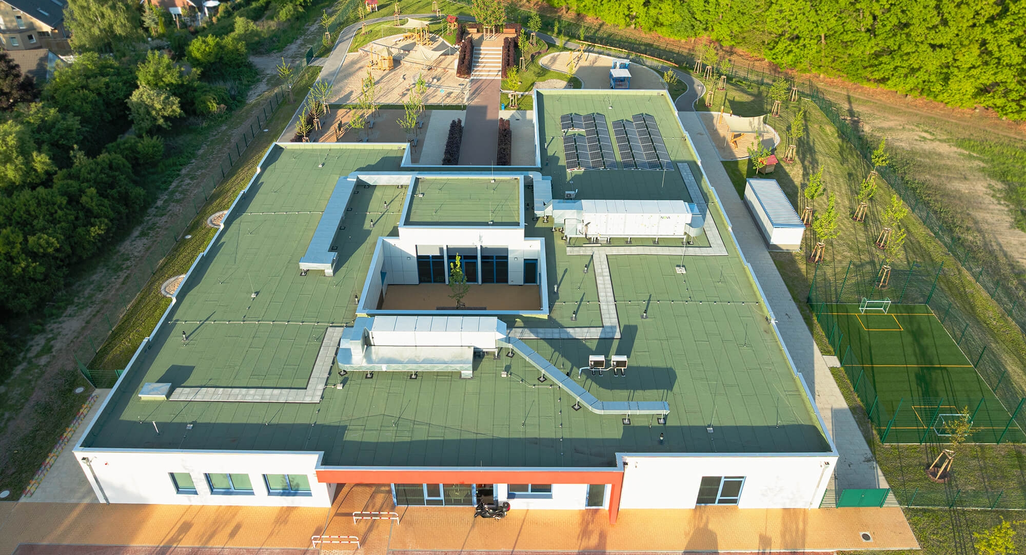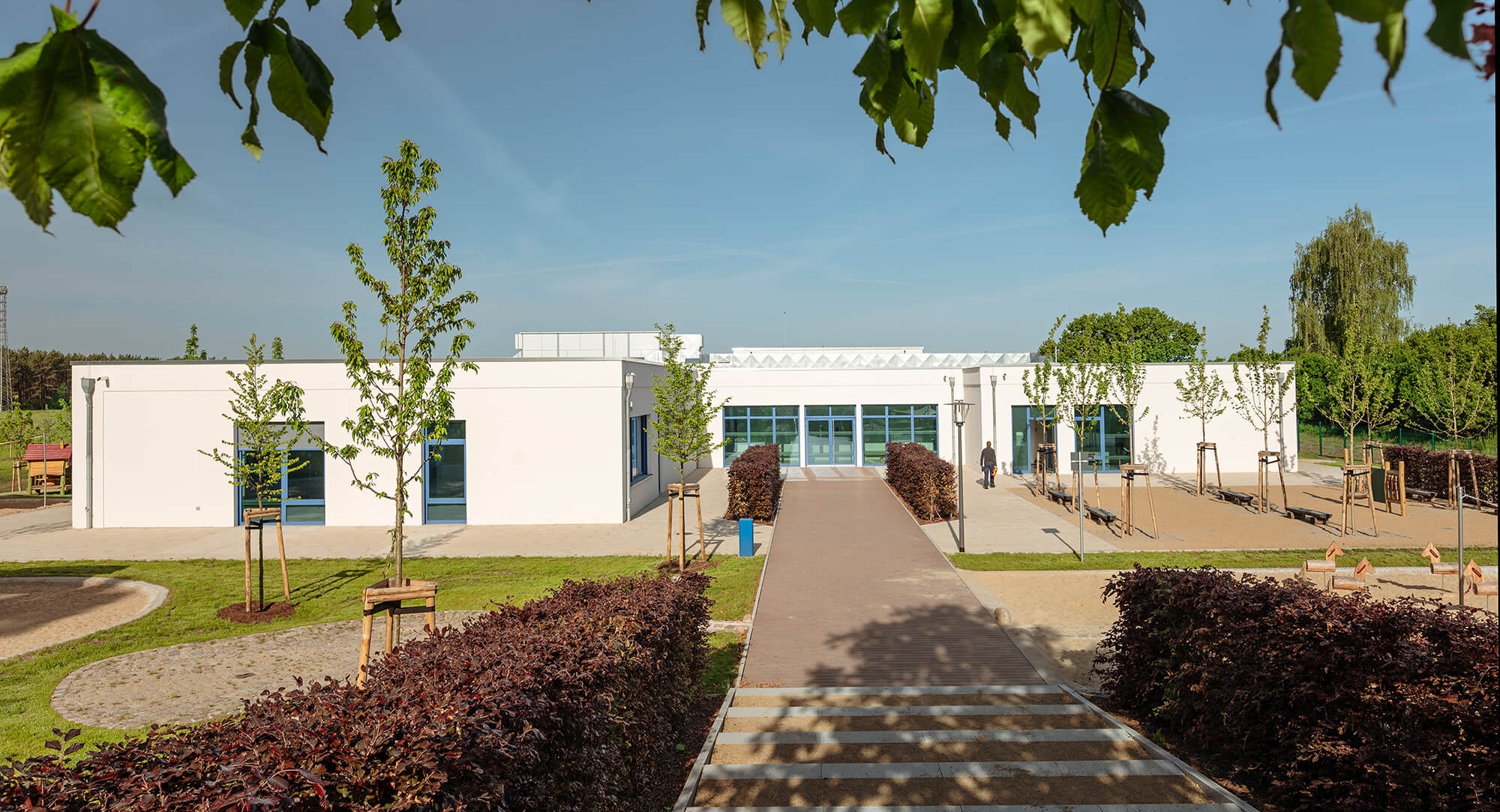 Der 1.630 m² große Neubau des Kindergartens in Blankenfelde-Mahlow wurde innerhalb von sieben Monaten von KLEUSBERG in Zusammenarbeit mit dem Architekturbüro LEITPLAN GmbH realisiert. Die 1-geschossige, barrierefreie Einrichtung entstand in Holz-Tafelbauweise und schafft durch die U-Form zwei klar gegliederte Bereiche mit einem geschützten Innenhof.