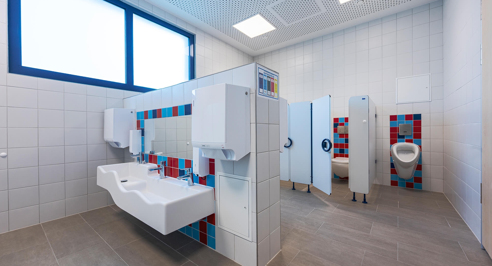 Ein verbindender Flur erschließt alle Raumbereiche und enthält integrierte Spielecken, die das Erleben und Erkunden über Raumgrenzen hinweg ermöglichen. Für die Kleinsten wurden zudem kindgerechte Sanitäranlagen und Wickeltische installiert.