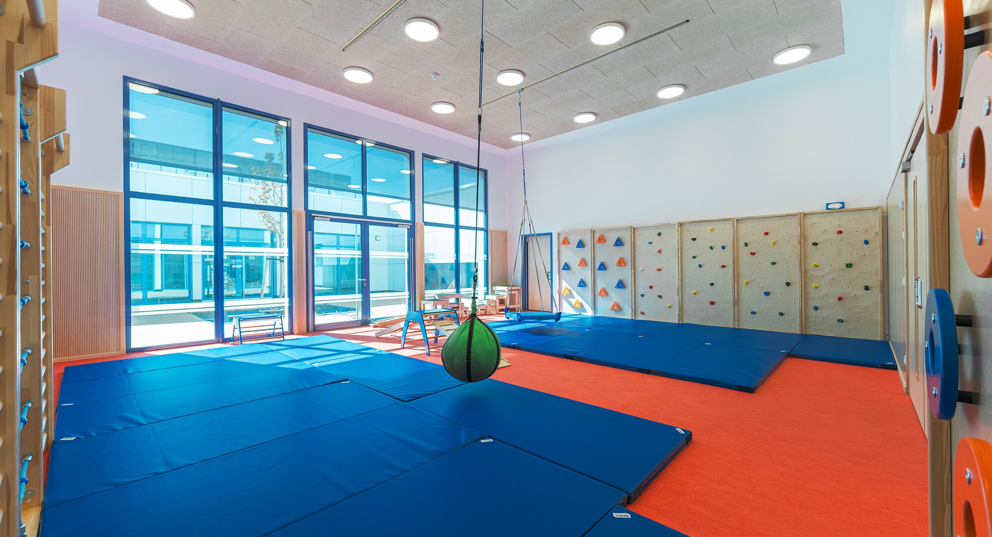 Im südlichen Trakt befinden sich fünf großzügig geschnittene Gruppenräume, die als Funktionsbereiche gestaltet und individuell ausgestattet sind – unter anderem mit Beamern, Podesten, Nestschaukeln sowie einem Werkraum. Ergänzt wird das Raumangebot durch vier Nebenräume und einen Ruheraum für den Ü3-Bereich, in dem sich die Kinder zurückziehen und entspannen können.