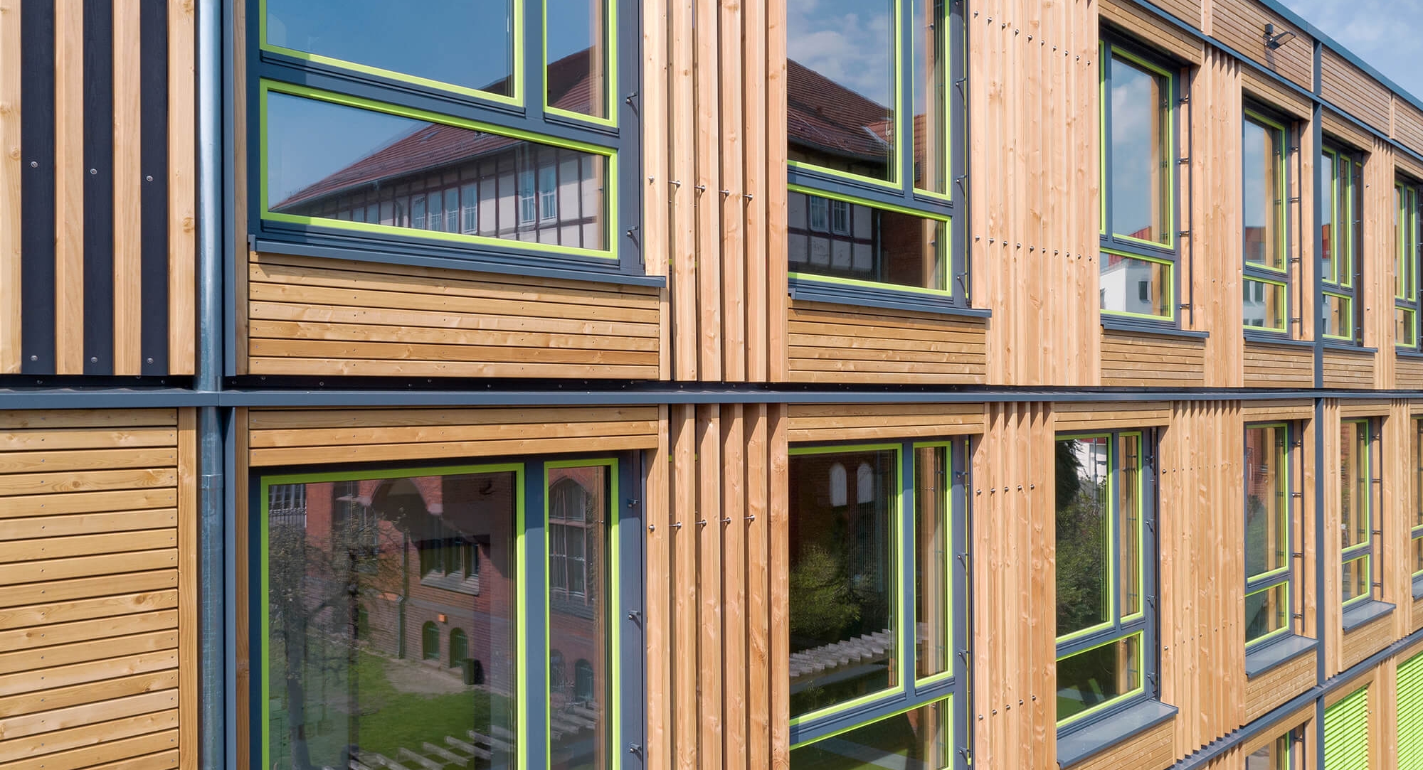 Nicht nur im Hinblick auf den Baustoff setzt der Bauherr auf Ökologie. Auch die Gebäudetechnik wurde bewusst ohne energieaufwendige Luft- und Klimageräte gewählt: Die Räume werden auf natürlichem Wege be- und entlüftet. Mittels automatischer Nachtauskühlung durch automatisiert öffenbare Fenster in Unterrichtsräumen und Fluren erfolgen der Luftaustausch und die Temperaturregulierung im Gebäude. Ein weiteres Argument für diese natürliche Lüftung: Die Gebäudesubstanz wird geschützt und Schimmelbildung vorgebeugt sowie Energie durch kontrolliertes Lüften und Schließen der Fenster im Vergleich zur ständigen mechanischen Lüftung eingespart. Gleichzeitig entstehen eine gesunde und angenehme Raumluftqualität und -temperatur. Im Inneren bleibt der Baustoff Holz weitestgehend sichtbar. Teilbereiche in Fluren und Nischen werden mit festverbauten Sitzgruppen aus Holz ausgestattet, durch die ruhige Lernplätze entstehen. Die Nischen erhalten farbigen Schallschutzvlies, welcher die Akustik in diesen Bereichen verbessert und zusätzlich gestalterische Akzente setzt. Innenliegende Verglasungen sorgen für Sichtbeziehungen zwischen den Räumen und lockern die Raumaufteilung auf.