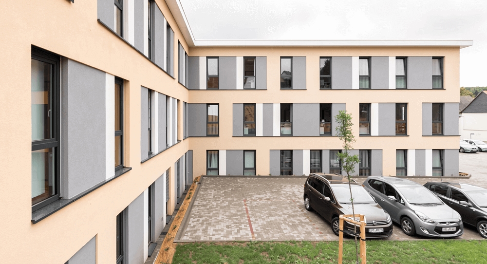Bei der Planung berücksichtigen die Beteiligten bereits jetzt die Option der späteren Umnutzung in beispielsweise eine Einrichtung für betreutes Wohnen. Zur besseren Orientierung sehbehinderter Menschen wurden an den Handläufen des Treppengeländers kleine Metallblättchen mit Blindenschrift sowie Trittstufenmarkierungen angebracht. Bodentiefe Fenster sorgen für natürlichen Lichteinfall in den Räumlichkeiten. Der Dachüberstand schützt die Fassade vor Niederschlägen sowie zu viel Sonne.