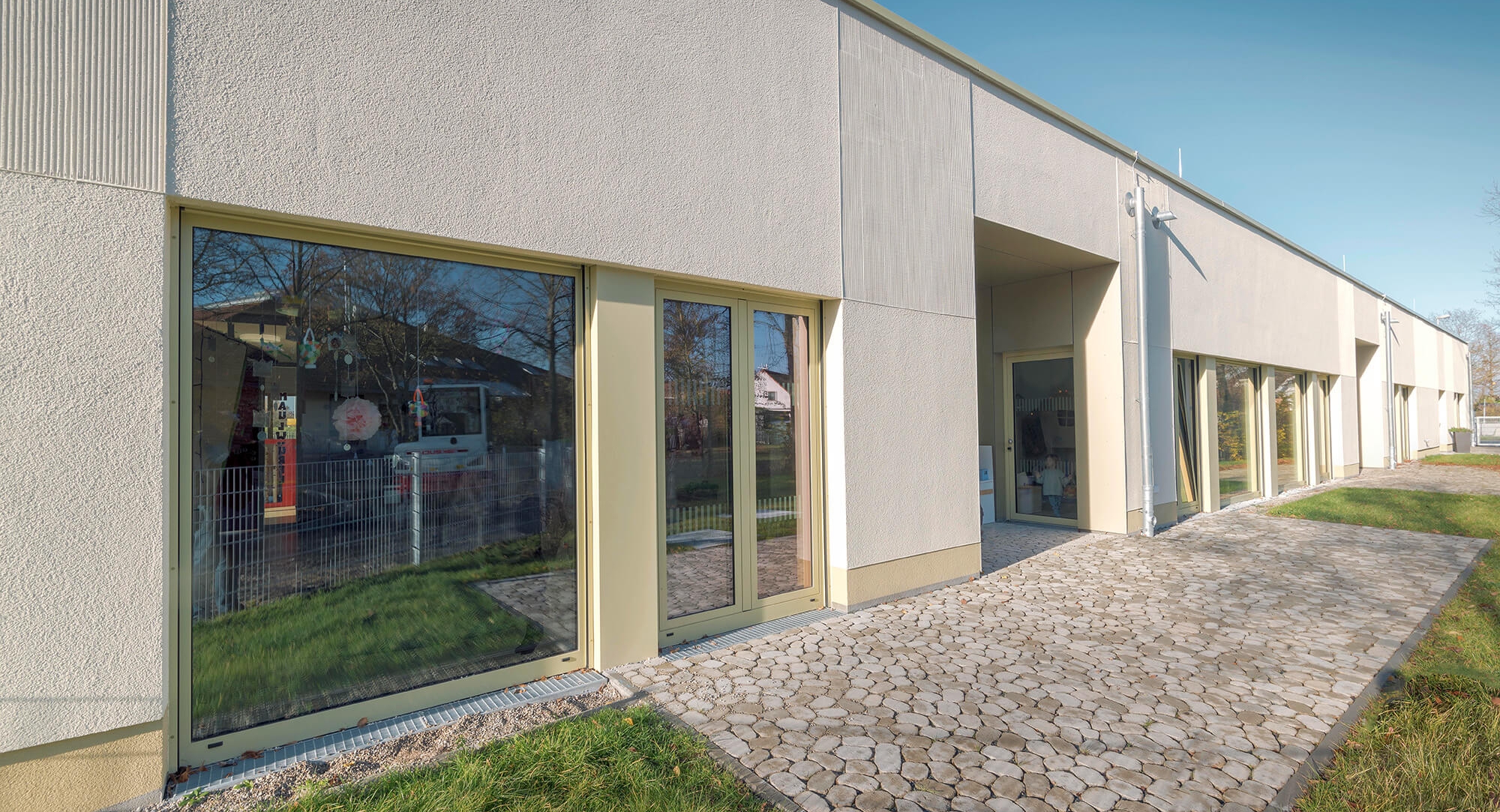 Mit der Fassadengestaltung in Erdtönen fügt der Neubau sich natürlich in die Umgebung ein. Durch die Kombination von Glatt-, Kratz- und Kammputzstrukturen sowie die in Teilbereichen zum Tragen kommende Alucobond-Fassade entsteht ein harmonisches Gesamtbild. Durch einen vorgelagerten Anbau, der sich mit einer geringeren Außenhöhe vom übrigen Gebäude absetzt, ist der Eingangsbereich geschützt und überdacht. Die Gruppenräume befinden sich südöstlich. Alle sind mit einem Zugang ins Freie angelegt. Diese Bereiche stellen sich als Rücksprünge in der Gebäudekubatur dar. Die Erschließung der Gruppenbereiche erfolgt über einen großzügigen, T-förmig verlaufenden Spielflur mit bunten Garderoben und Sitznischen. Diese Nischen dienen insbesondere als Wartebereiche für Eltern. Jeder der Gruppenräume verfügt über eine eigene Küchenzeile und grenzt an einen Sanitärbereich an, der von jeweils zwei Gruppen genutzt wird. Neben kindgerechten Toiletten und Waschbecken sind die WCs mit extra kleinen Duschvorrichtungen sowie Wickelkommoden ausgestattet.