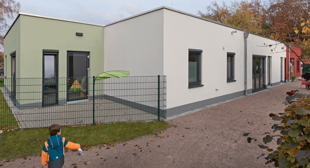Mit dem Bau der neuen Kinderkrippe reagierte die Gemeinde Großhansdorf auf den steigenden Zuzug vieler Eltern mit kleinen Kindern. KLEUSBERG errichtete diese neue Einrichtung in modularer Bauweise. Insgesamt 20 Kinder im Alter zwischen 1 und 3 Jahren können dort in 2 Gruppen betreut werden. 7 Erzieherinnen kümmern sich um das Wohl der Sprösslinge.