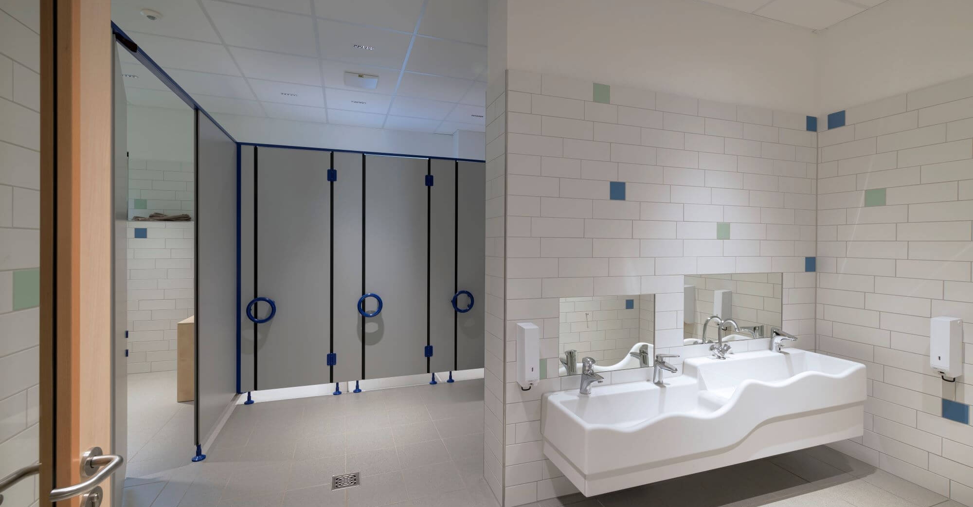 Die 2-geschossige Einrichtung verfügt zudem über verschiedene Spielmöglichkeiten im Außenbereich. Ein Fluchtwegbalkon wurde als Deckenauskragungen der Erdgeschossdecke angebracht, dessen Brüstung mit Aussparungen aus Sicherheitsglas versehen ist. Er verbindet die Gruppenräumen auch außerhalb miteinander. Im Sanitärbereich sind die Waschbecken in verschiedenen Höhen platziert worden, so dass für jedes Kind die Nutzung problemlos möglich ist.