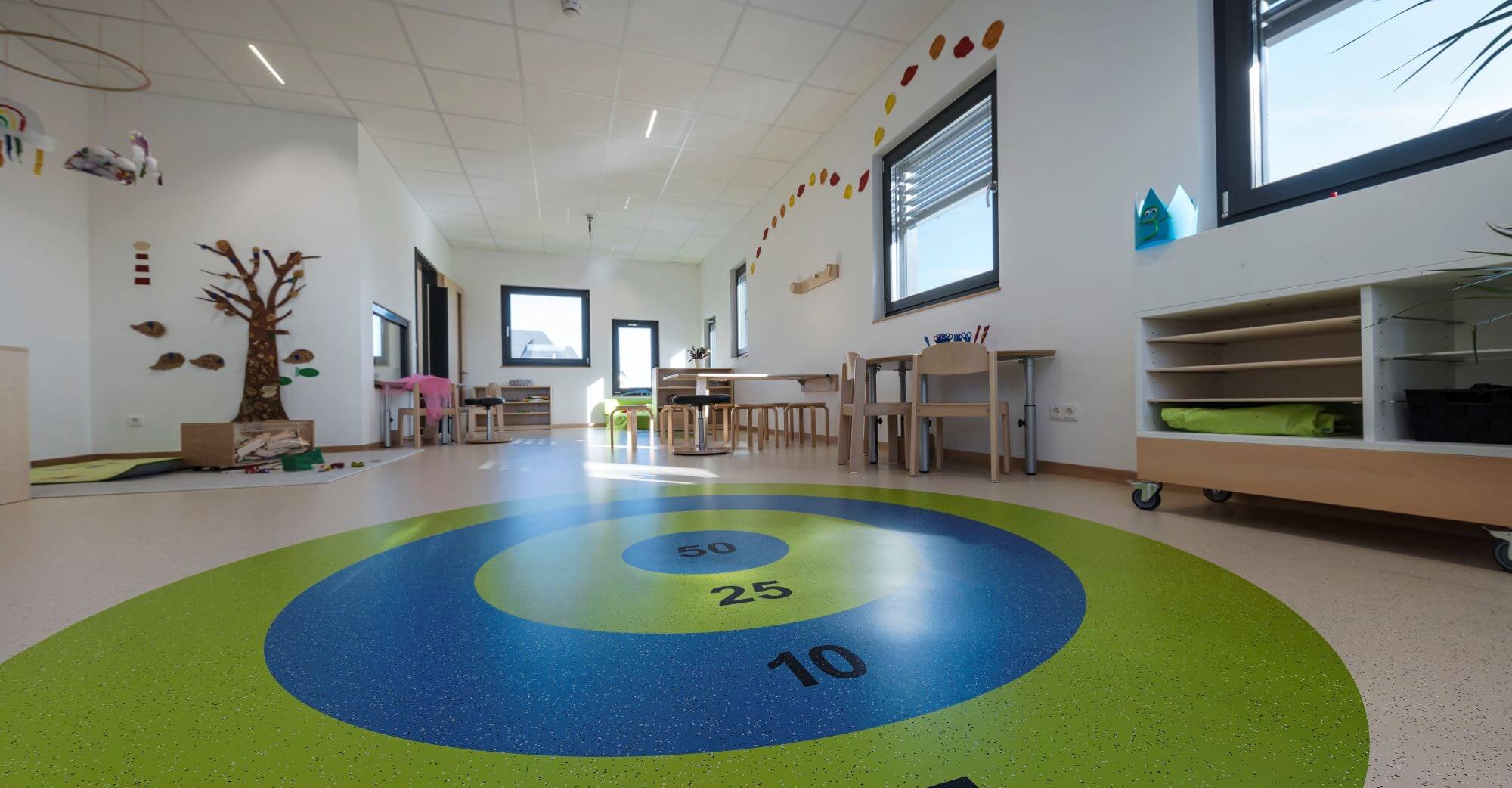 Eine weitere Besonderheit der Kita ist der Fußboden, der verschiedene Spielmöglichkeiten bietet. Als Teil des pädagogischen Konzeptes wurden mithilfe von Intarsien, beispielsweise Hüpfspiele in den Kautschukboden integriert.