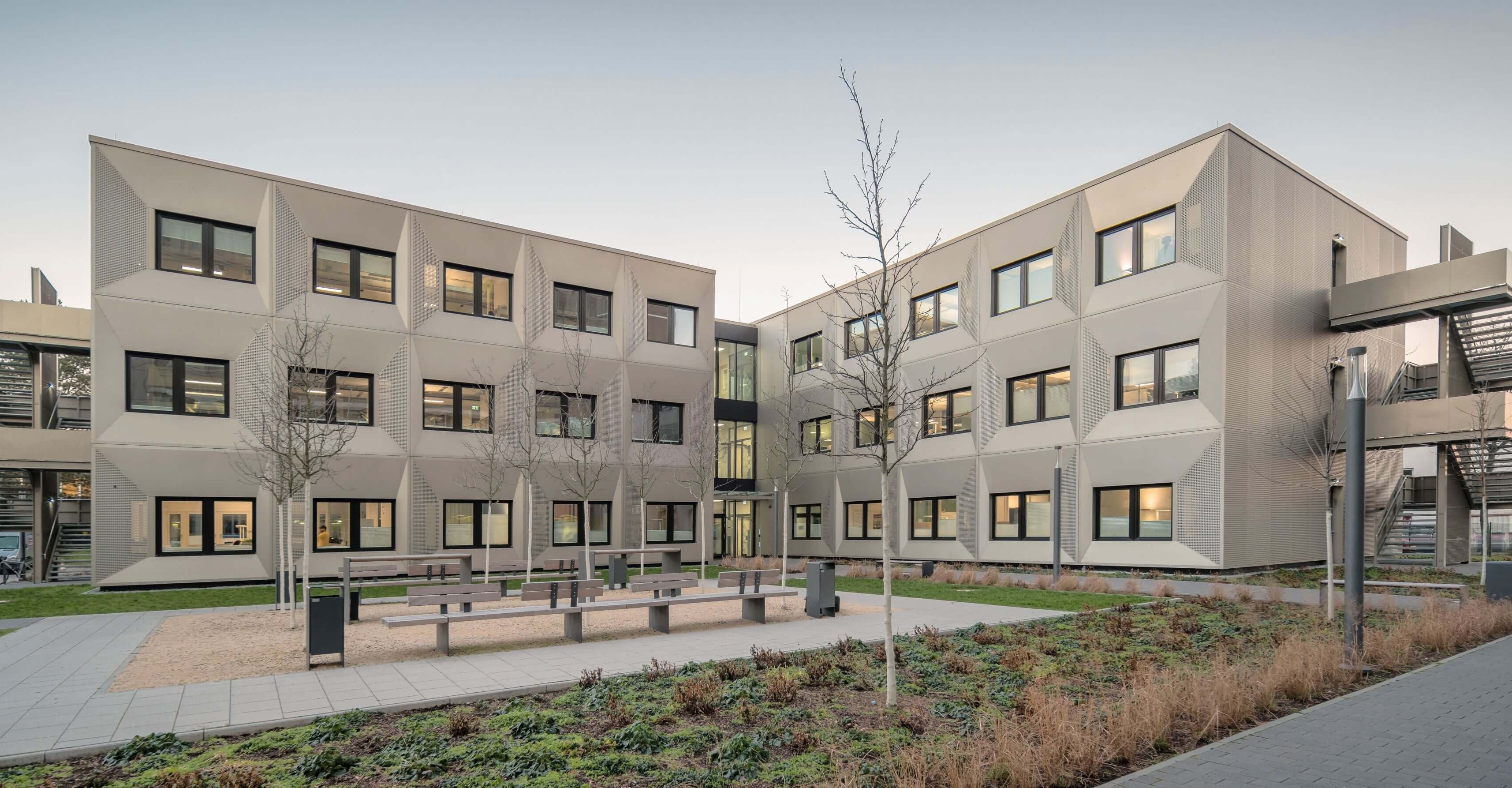 Ende Oktober 2020 begann die Modulmontage für das 2.235 m² große Gebäude in Darmstadt. KLEUSBERG erhielt im Rahmen einer Ausschreibung den Zuschlag für die Realisierung. Gefordert war ein neues Bürogebäude, dass unterschiedliche Arbeitsplatzmodelle beziehungsweise Raumkonzepte zulässt, die die Mitarbeiter:innen der Kreisverwaltung zunächst testen sollen, um das effektivste Modell ausfindig zu machen. Da die Außen- und Innenwände eines Modulgebäudes nicht tragend ausgeführt sind, lassen sich Raumkonfigurationen problemlos an sich verändernde Anforderungen anpassen. Freistehende Energiesäulen innerhalb des Gebäudes bieten die nötige medientechnische Flexibilität. Auf Abhangdecken wurde verzichtet. Stattdessen sorgen Deckensegel in den Büros für eine gute Raumakustik, welche gleichzeitig ein architektonisches Gestaltungselement darstellen. Sichtbare Lüftungskanäle und Elektroinstallationen unter der Decke zählen ebenfalls dazu. Durch Glastrennwände und Raumeinbauten stellen sich die gesamten Innenräume transparent dar.