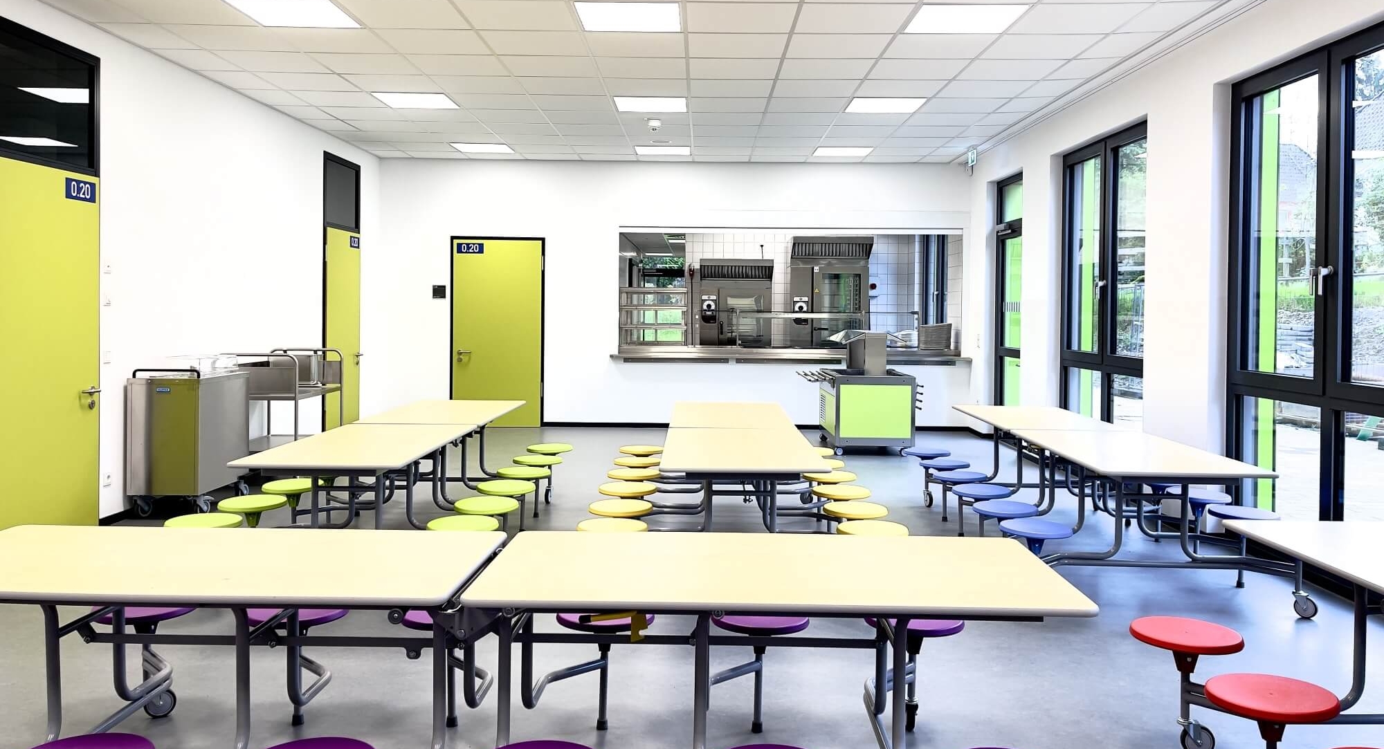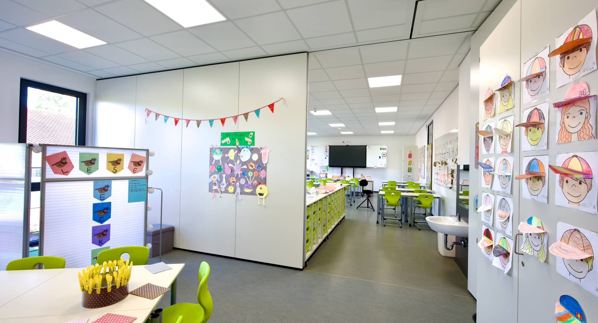 Ein umfassendes barrierefrei-Konzept, inklusive eines Aufzugs, gewährleistet die Zugänglichkeit aller Bereiche. Die Raumgestaltung umfasst nicht nur 6 Klassenzimmer, sondern auch zugehörige Differenzierungsräume, die durch mobile Trennwände flexibel miteinander verbunden werden können. Zusätzlich wurden ein Mehrzweckraum und ein komfortables Lehrerzimmer geschaffen.