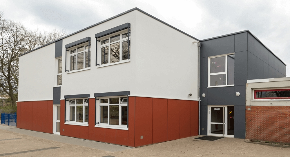 Die Einrichtung einer gymnasialen Oberstufe an der Hahnheide-Schule in Trittau führte dazu, dass die vorhandenen Klassenräume nicht mehr ausreichten und ein Anbau errichtet werden musste. Die modulare Bauweise kam hier wie gerufen. Binnen 9 Wochen Bauzeit konnten KLEUSBERG 12 zusätzliche Klassen schlüsselfertig an den Bauherrn übergeben. Farblich hat man sich an dem Bestandsgebäude orientiert. Daher erhielt der Anbau eine Kombination aus weißem Putz und roten Holzwerkstoffplatten. Die etwa 50 Quadratmeter großen Klassenräume können im Bedarfsfall geteilt werden. Zudem verfügt jedes Stockwerk über zwei Klassenzimmer mit mobiler Trennwand, sodass bei Prüfungen, Konferenzen und Aufführungen ein großer Veranstaltung- bzw. Großraum geschaffen werden kann. Ein so genannter Stiefelgang verbindet den Neubau mit dem bestehenden Schulgebäude.